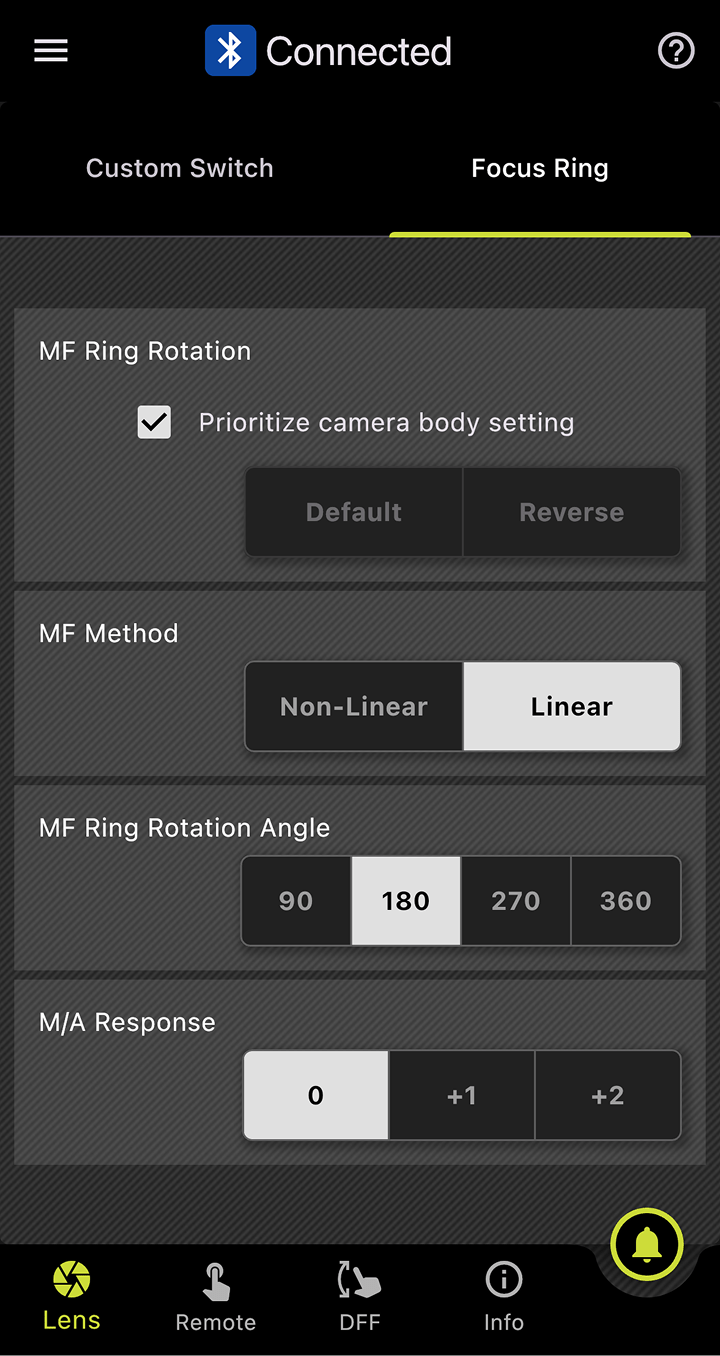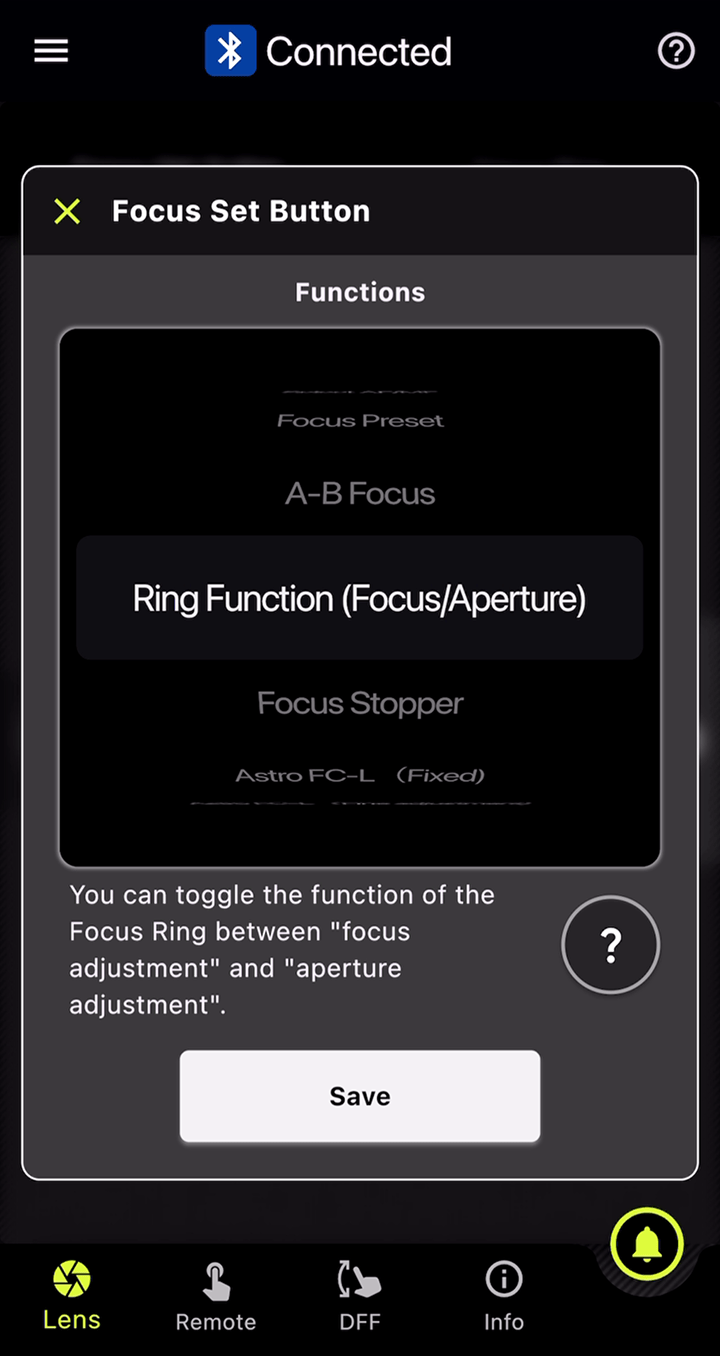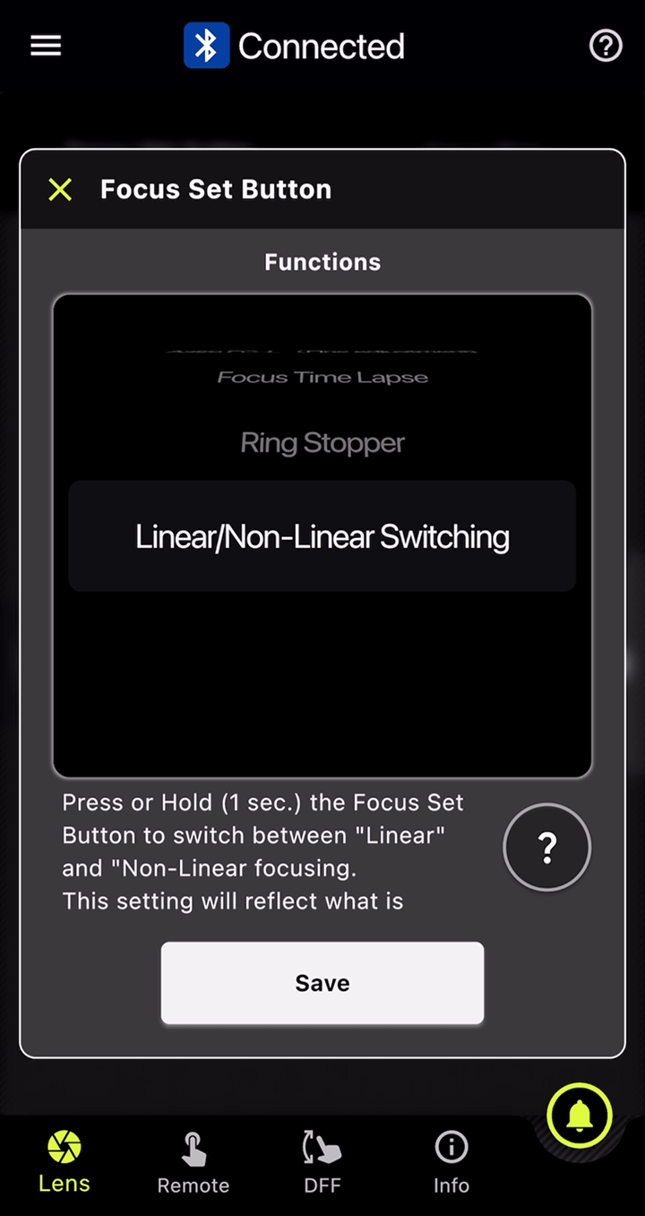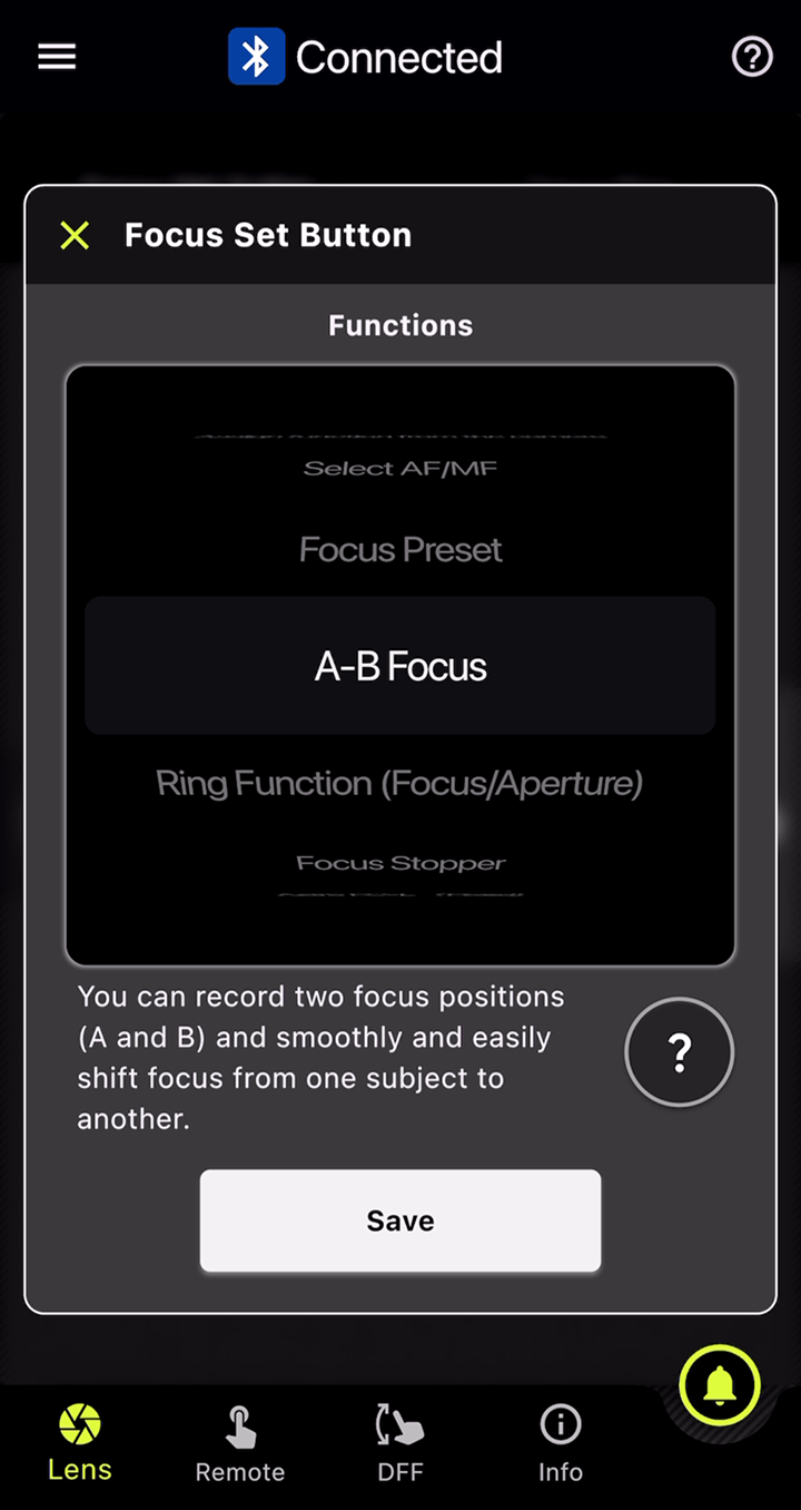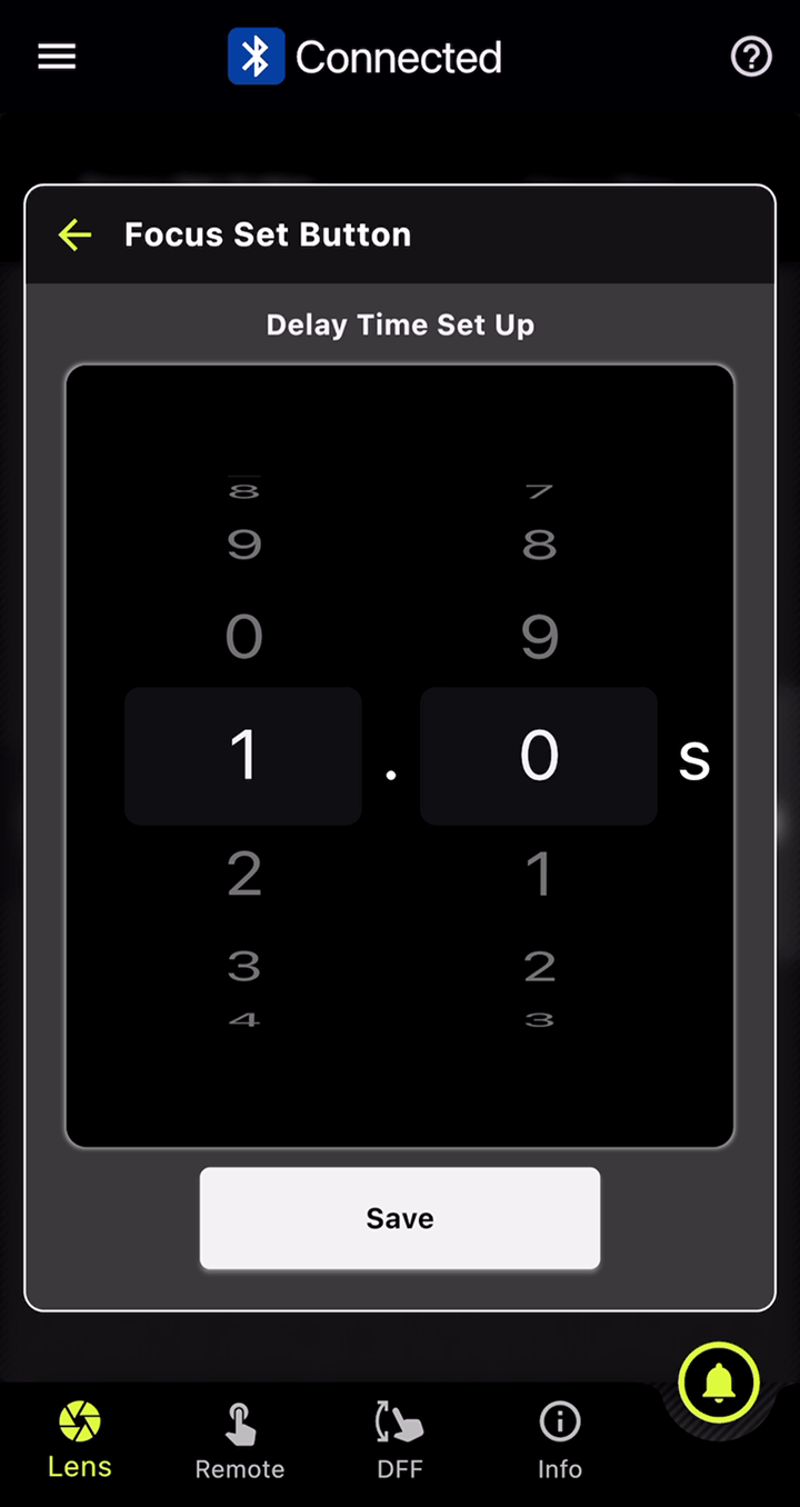 此功能可在对焦环和光圈环上分别设置标记。在DFF(Digital Follow Focus)界面中,只需轻点一下即可同时将焦点和光圈值移至预先设置的标记位置。